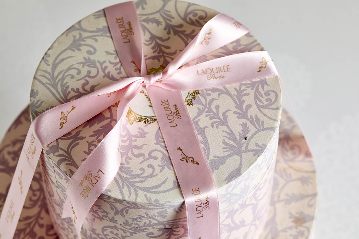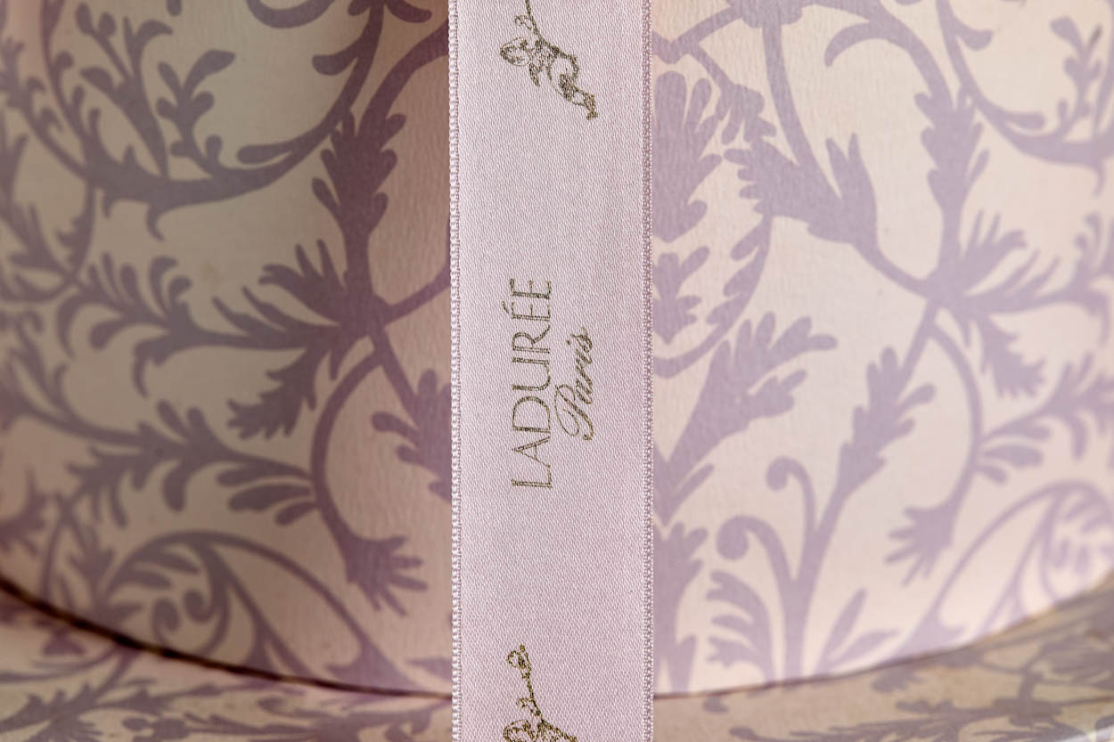 They are the prettiest shade of lavender and both say "Laduree" in gilt. They even come with their ribbon.