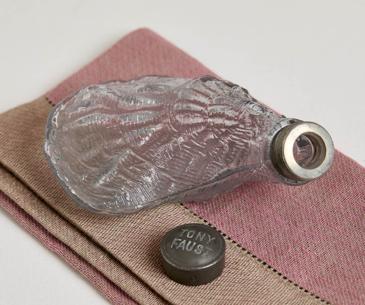 The flask measures 5-1/2" by 3-3/4" and is in excellent condition. The cap is stamped, "Tony Faust".