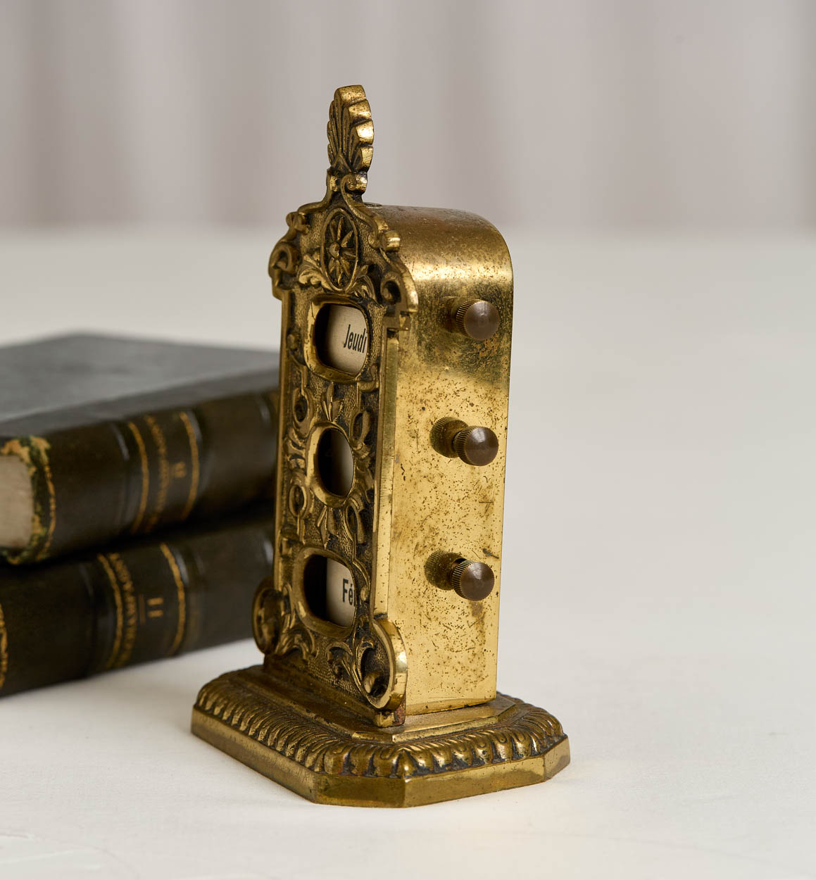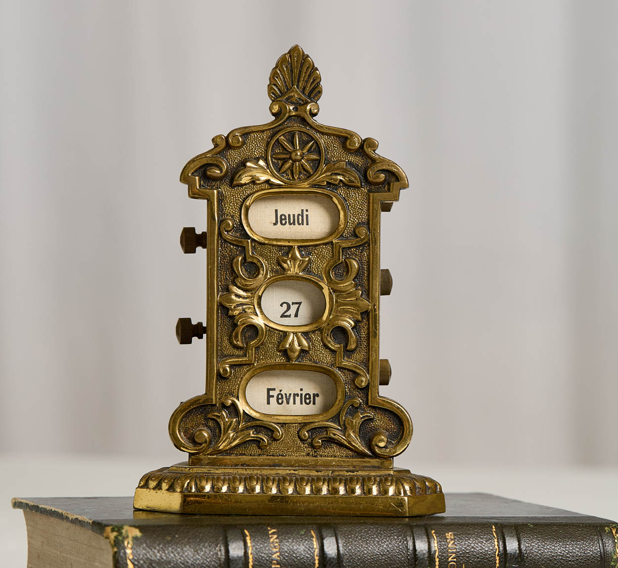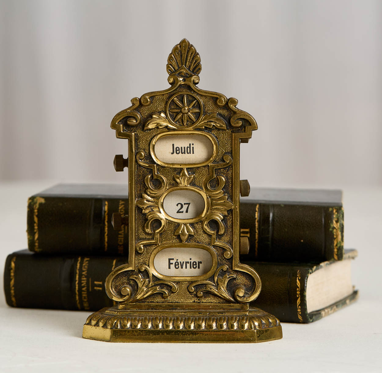 A rare Victorian era French brass perpetual desk calendar. This calendar is so ornate and beautiful.