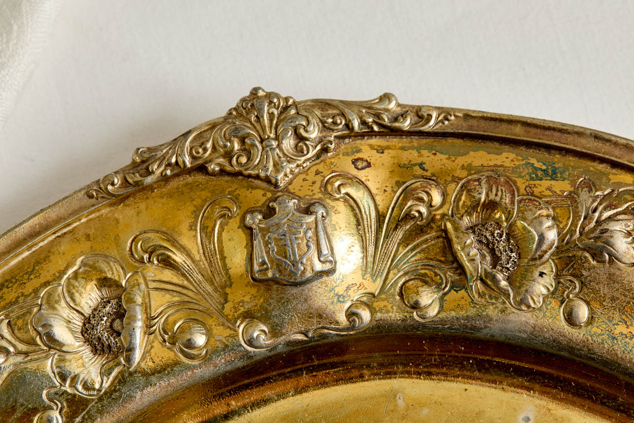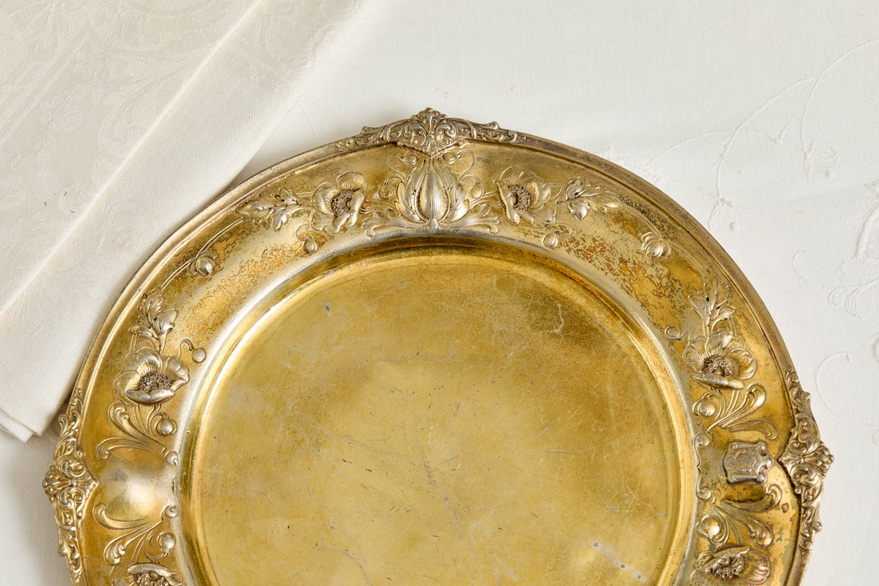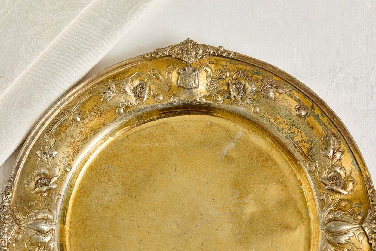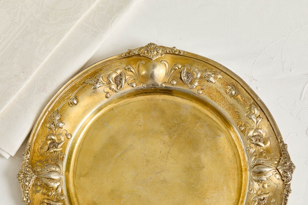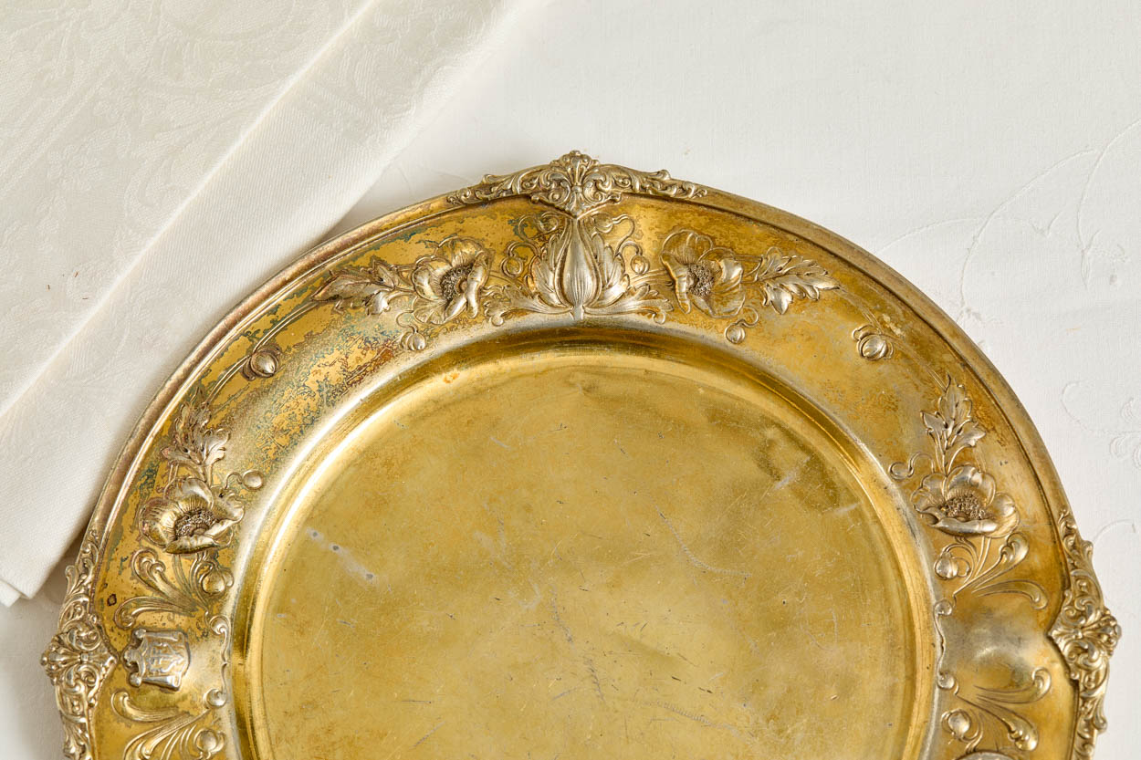 This incredibly rare Victorian gilded silver plate charger is from the Fairmont Hotel, San Francisco Presidential Suite. It was acquired from a collector's lavish estate.
