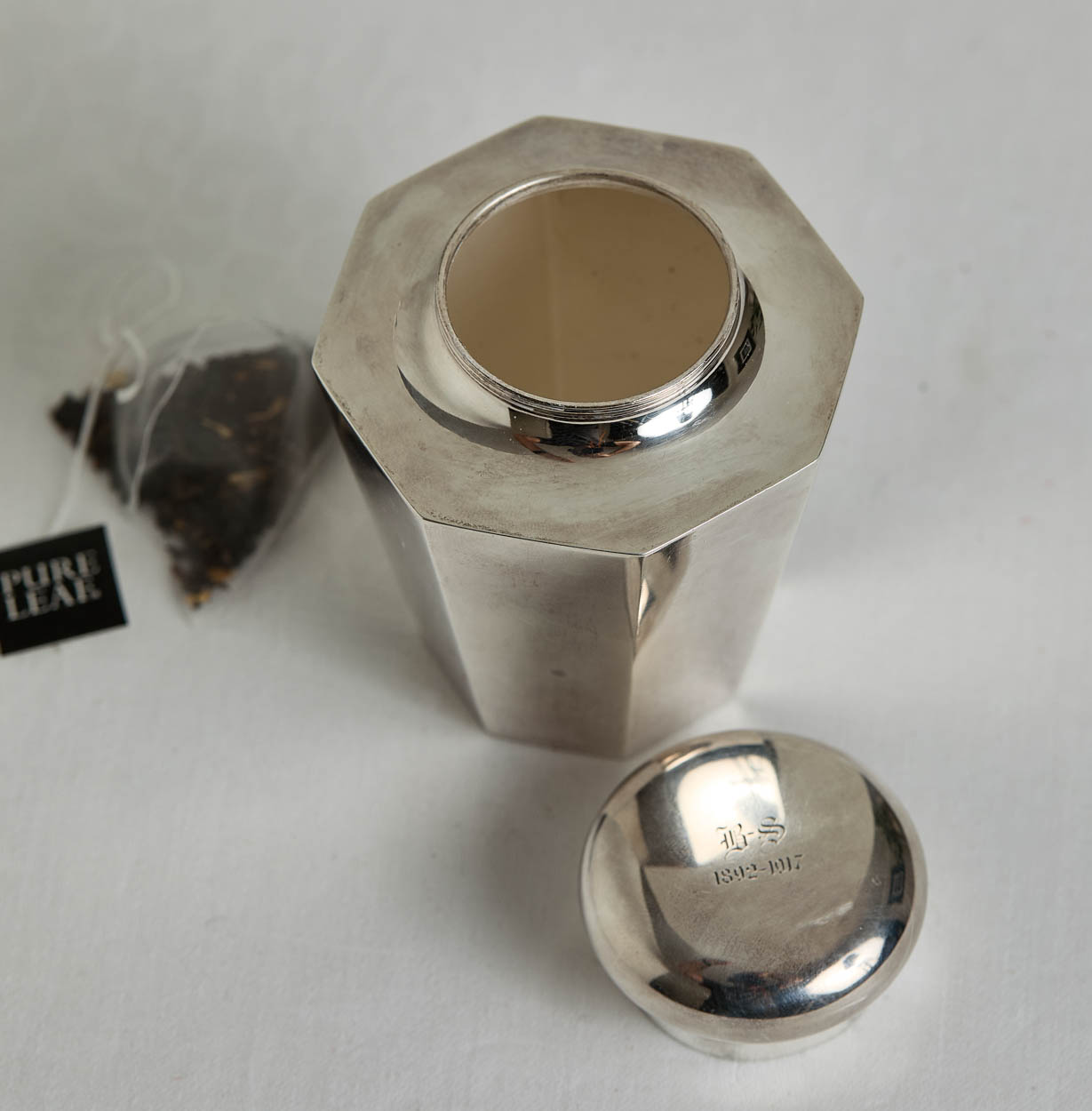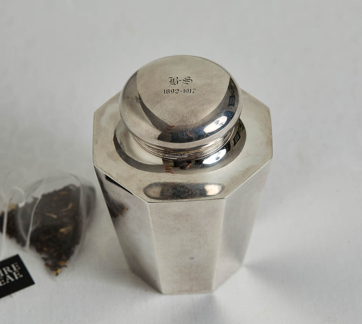 The faceted caddy has an engraved lid that reads, "B-S 1892-1917".