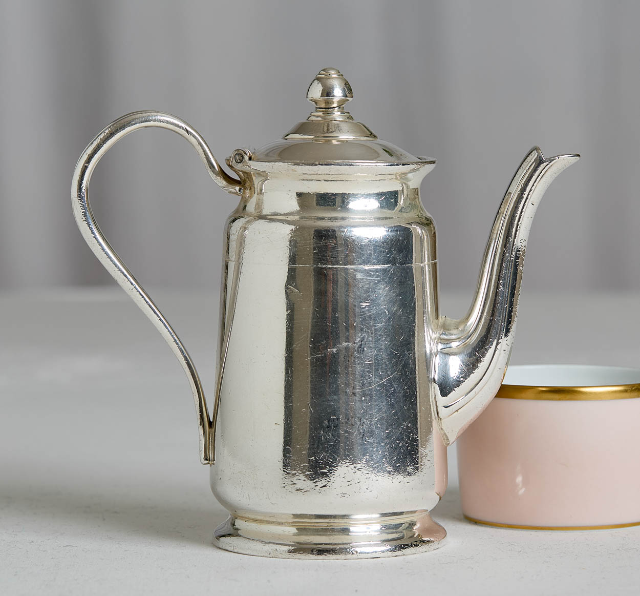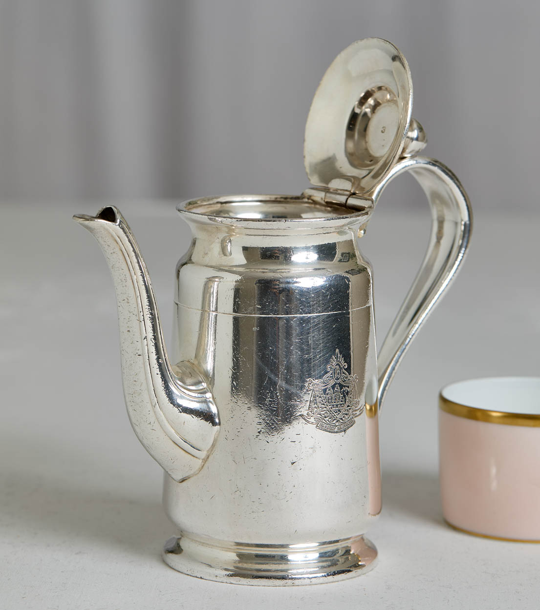 The teapot bears the hotel's crest/name on the side.