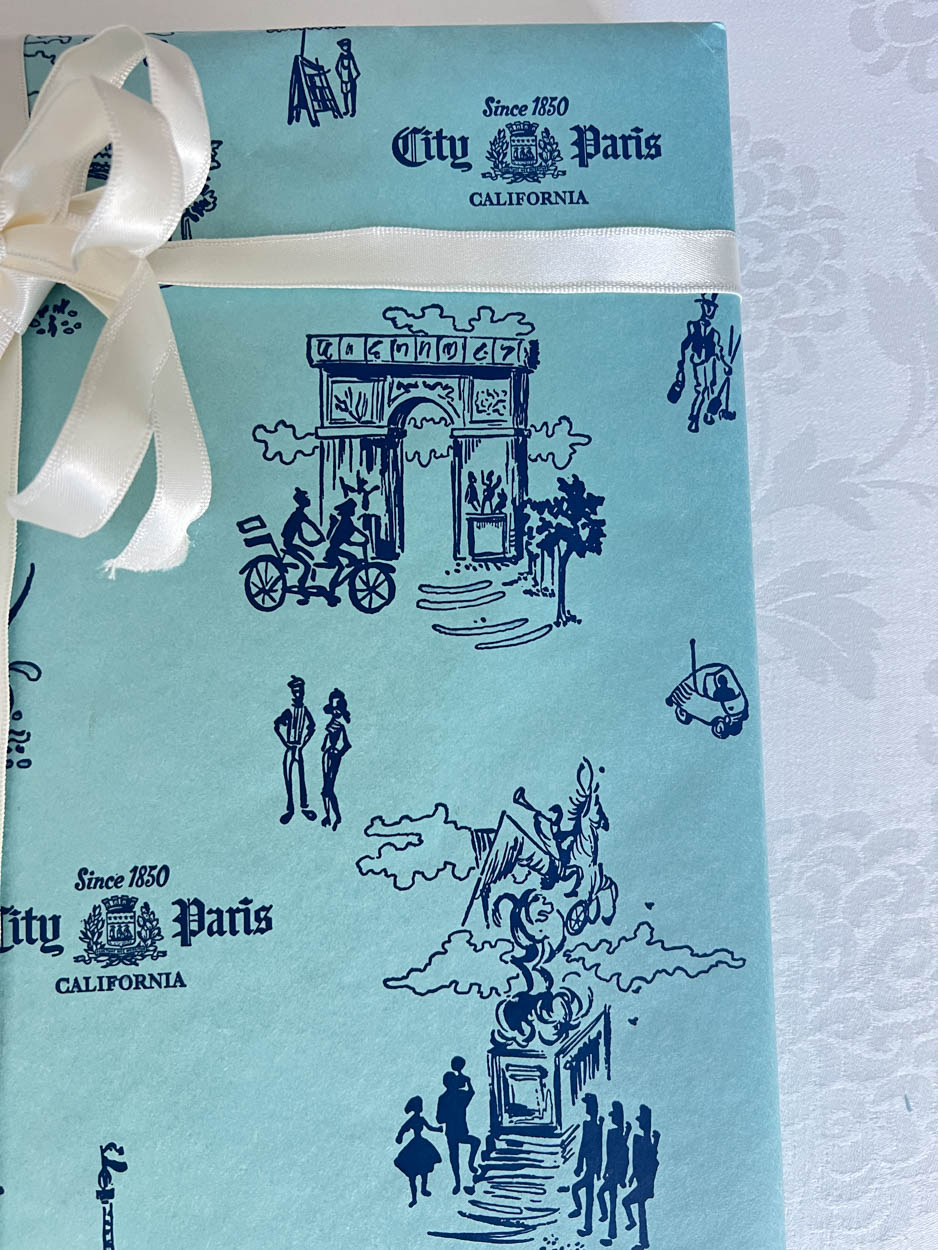 A marvelous find! Yards and yards of vintage gift wrapping paper from the iconic City of Paris, San Francisco.