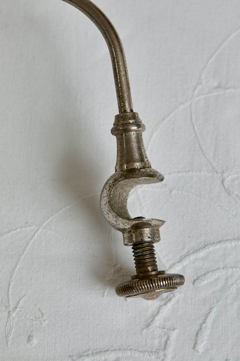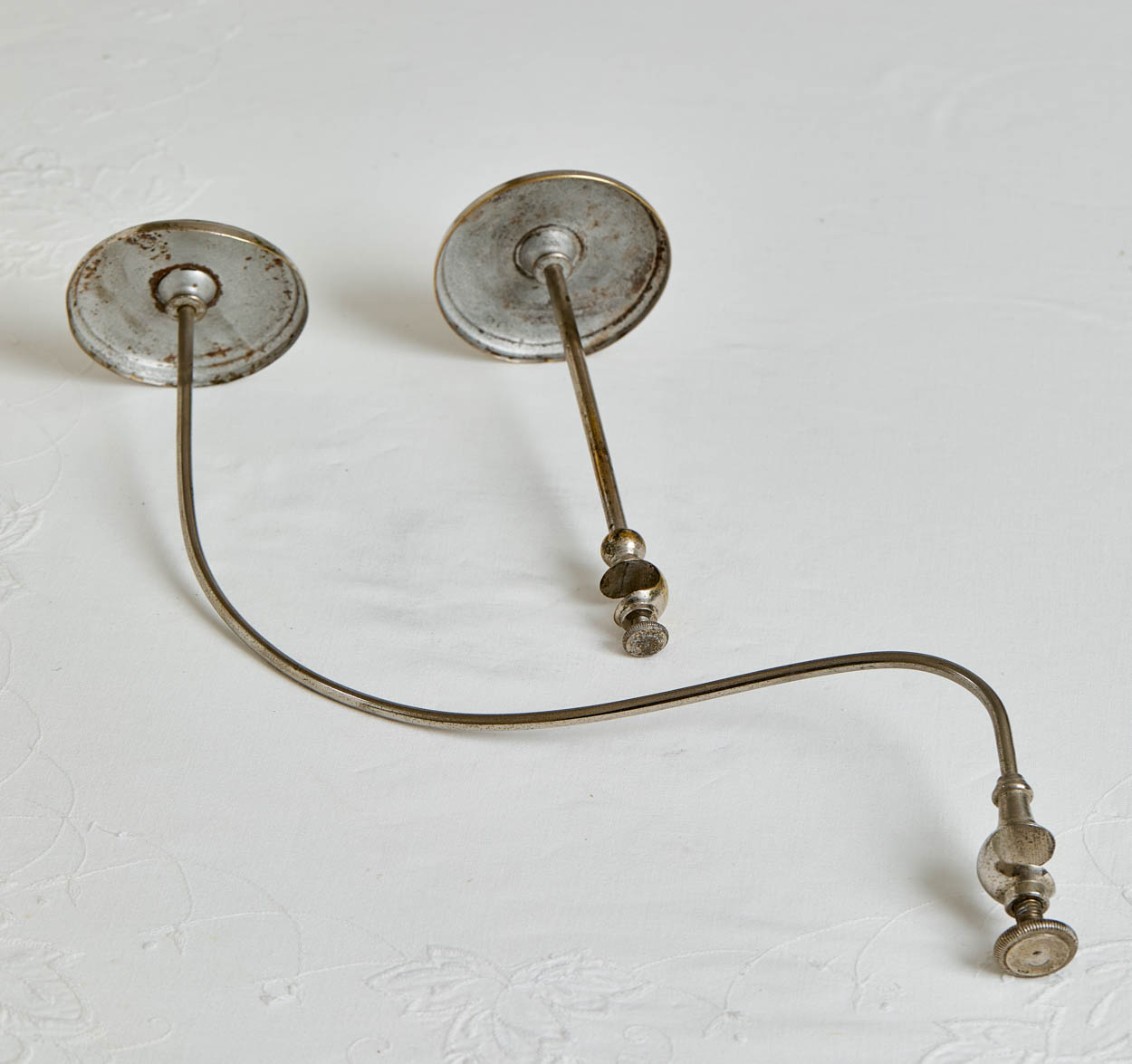 These are quite unusual. They would have been attached to tabletops or shelves and the hats rest on the face of them. Made of silvertone metal.