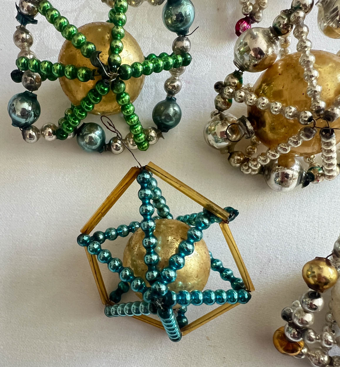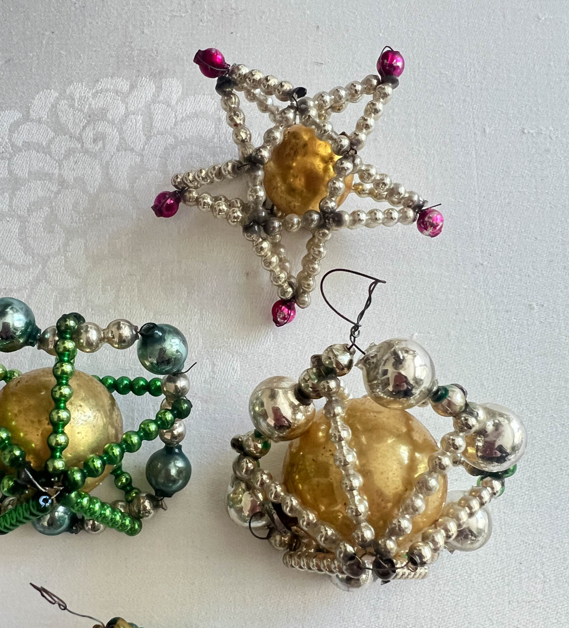 Acquired from an old San Francisco estate, wonderful set of 5 vintage figural mercury glass beaded ornaments.