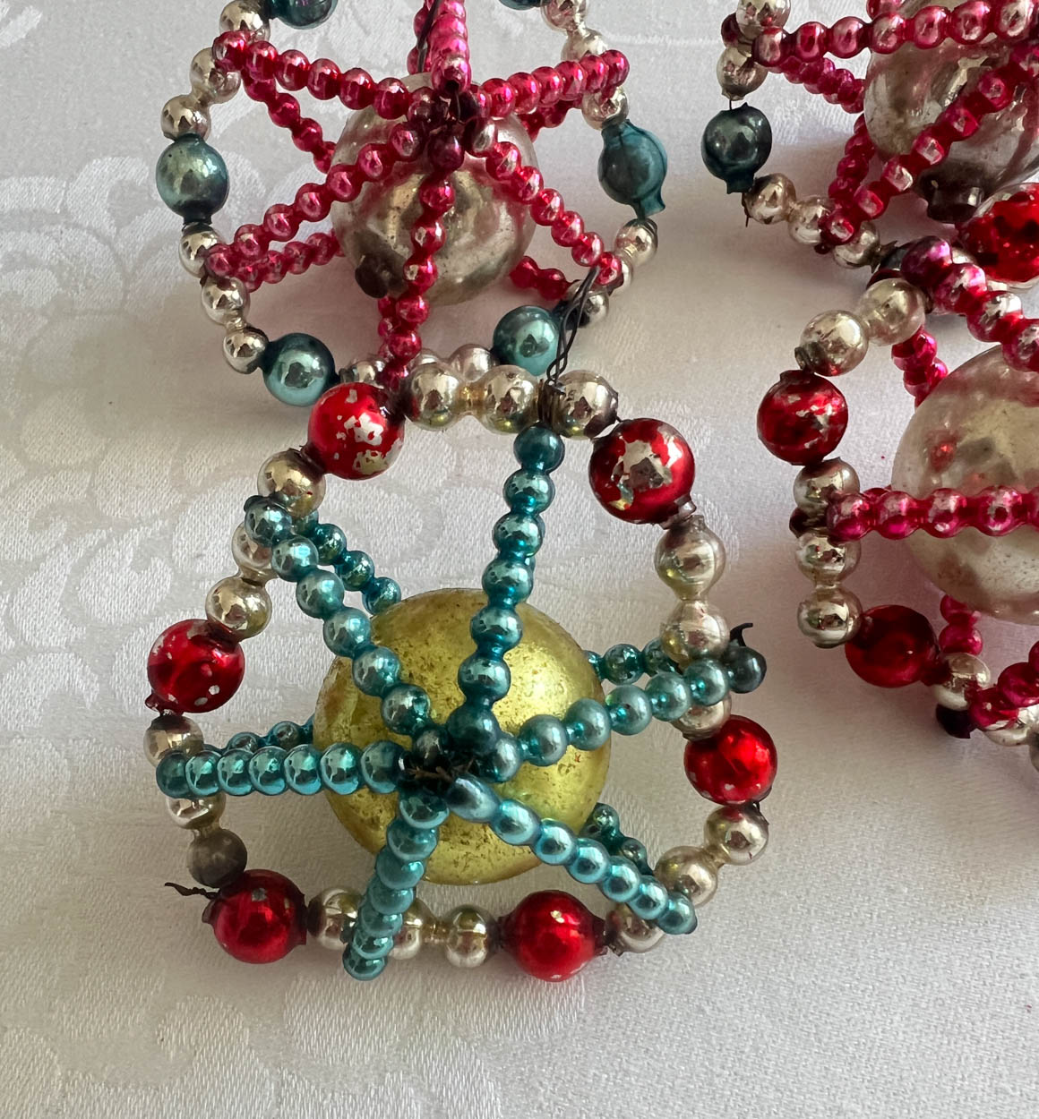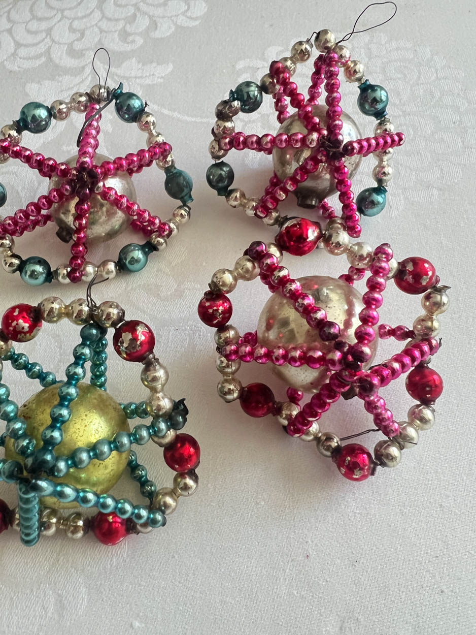 Set of 4 Vintage Mercury Glass Beaded Figural Ornaments