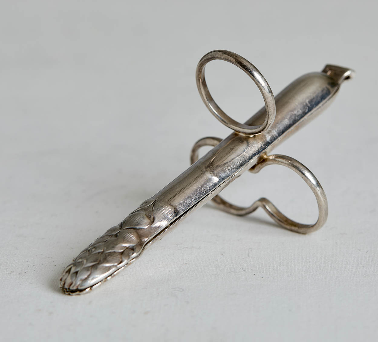 The asparagus-shaped tongs measure 4-3/4" long. They are in excellent condition.