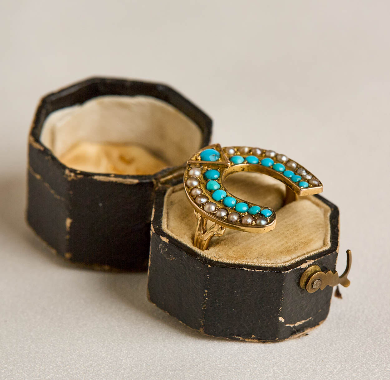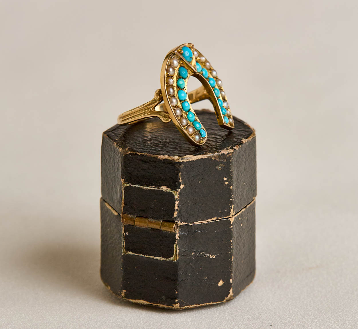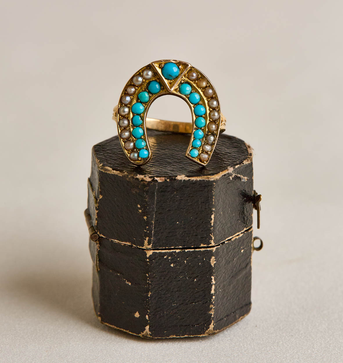 Highly sought after Victorian turquoise and seed pearl lucky horseshoe ring. Horseshoe jewelry has become quite collectible these days.