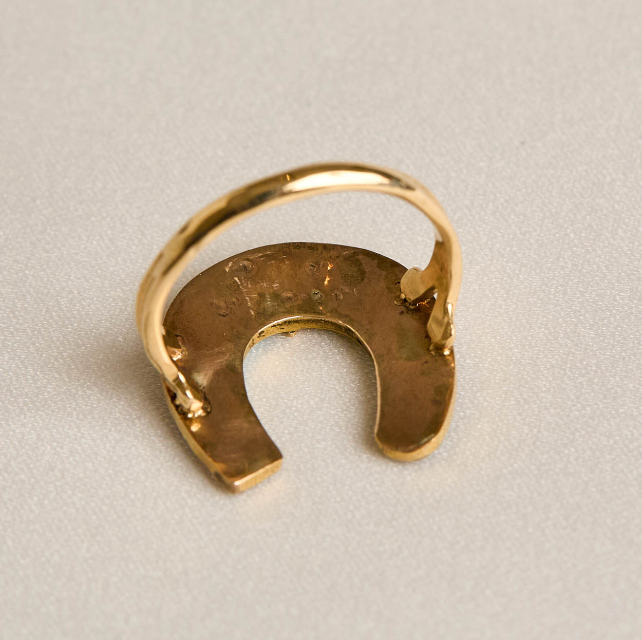 The shank of the ring is 14K gold and the top is 10K gold. The horseshoe measures approx. 3/4" by 3/4". Total weight is 3.9 grams. Ring is a US size 5 and is resizeable.