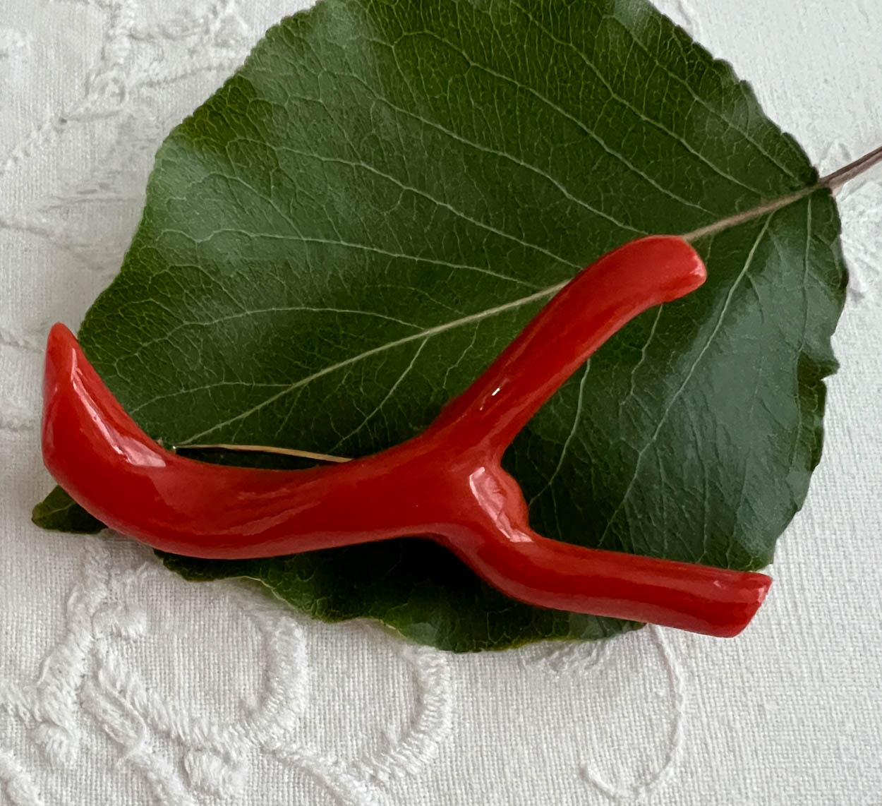 Beautiful Victorian oxblood coral branch brooch set in 18K gold.
