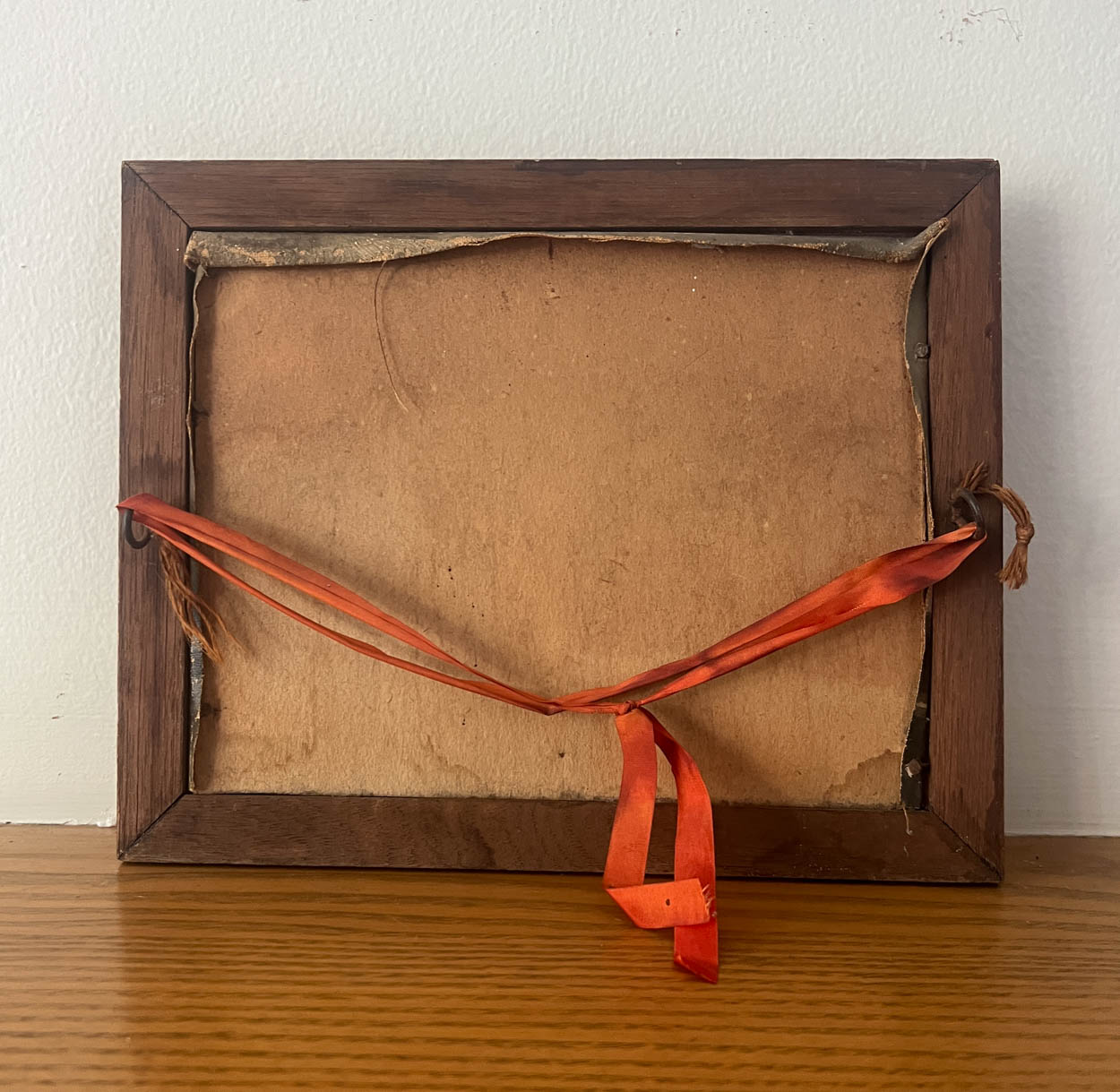 The painting has pretty colors and is nicely executed on panel. Framed in a wooden frame that measures 10" by 8-1/8".