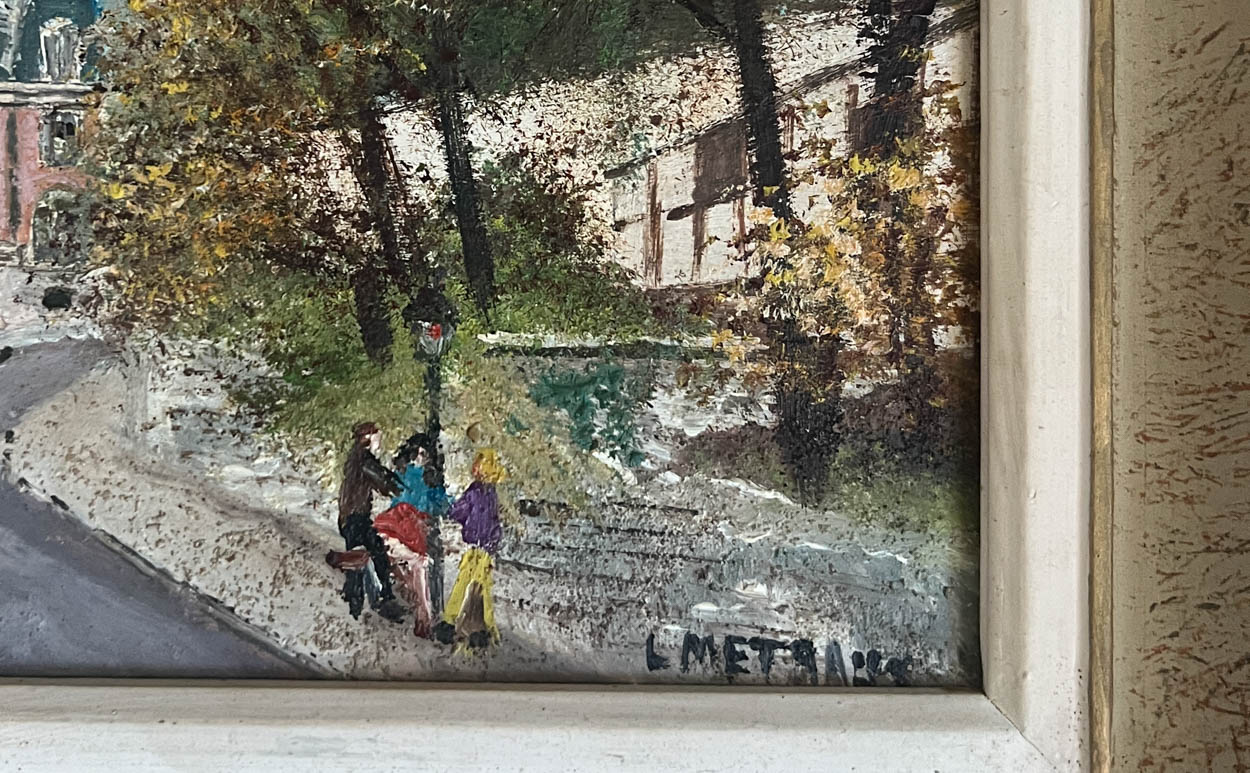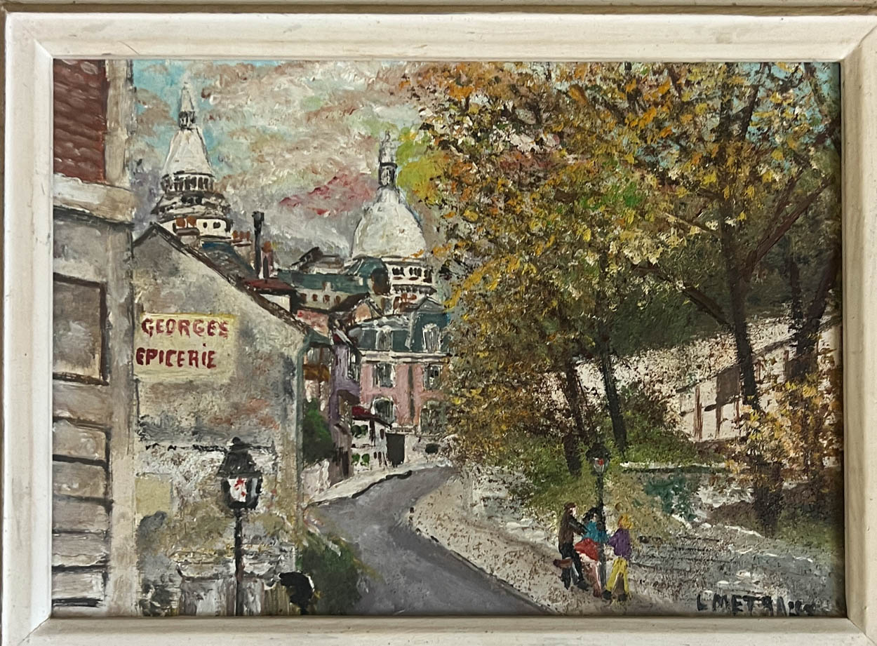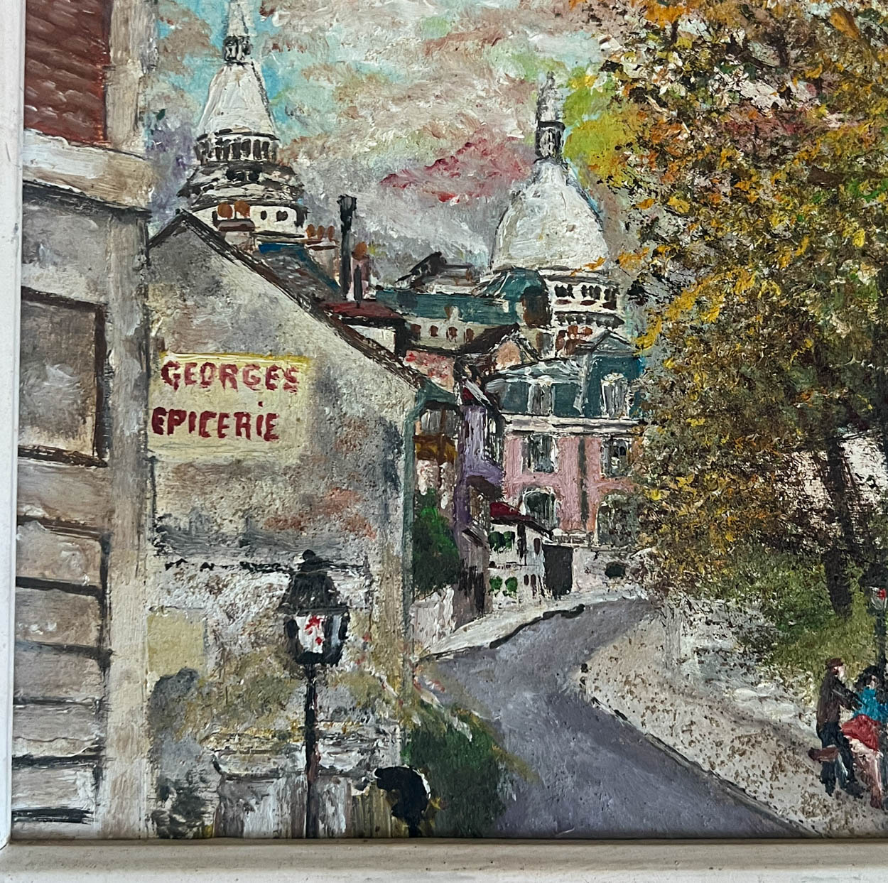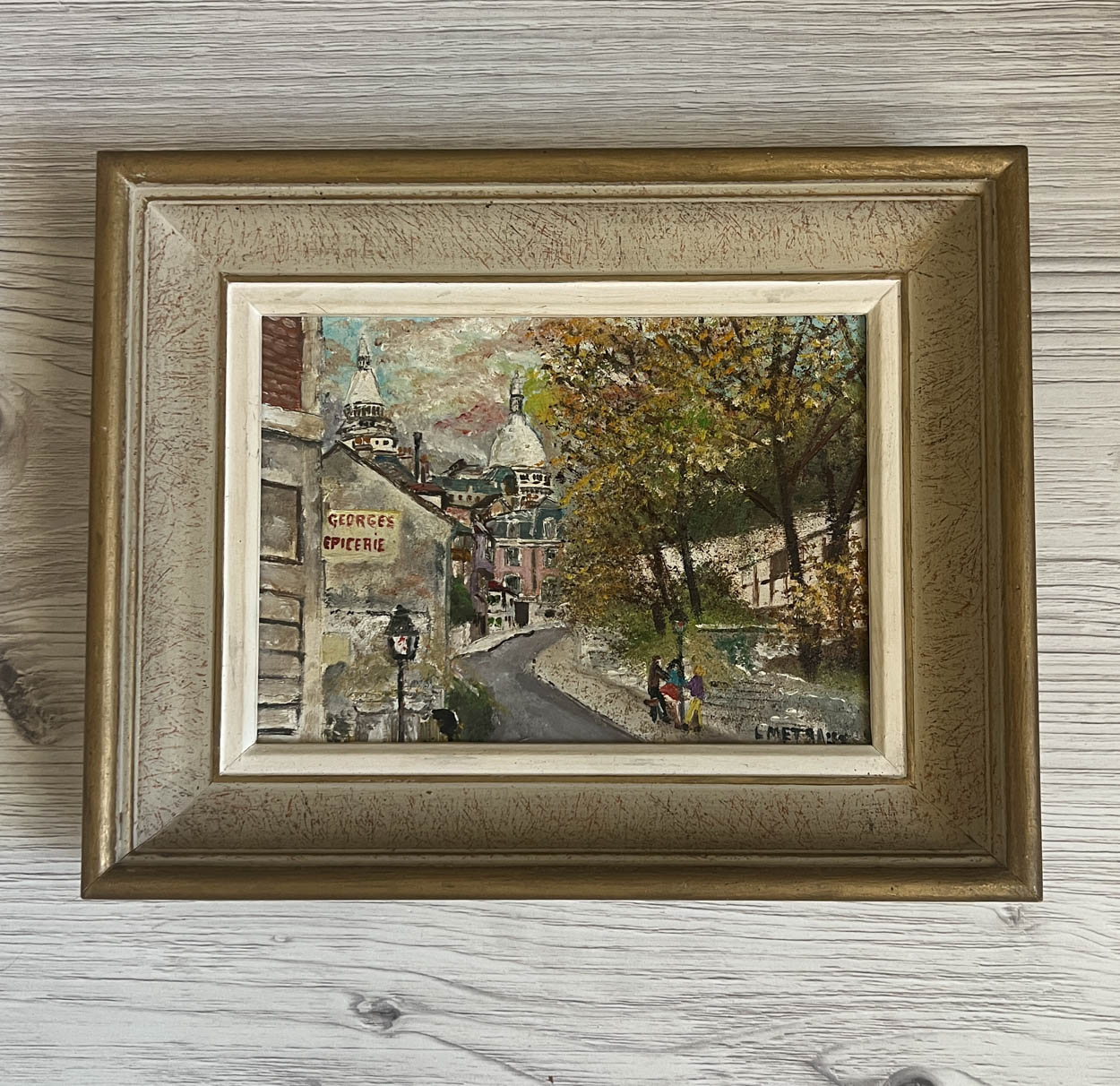 Acquired at a Paris flea market, a charming c. 1940s oil painting featuring a colorful Parisian street.