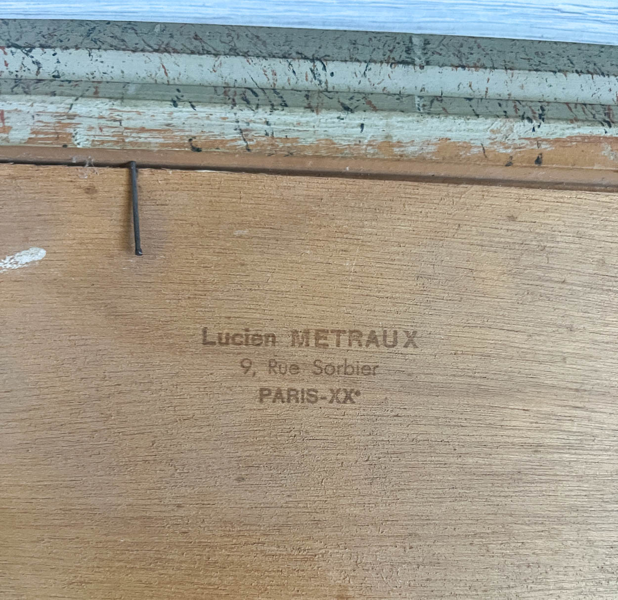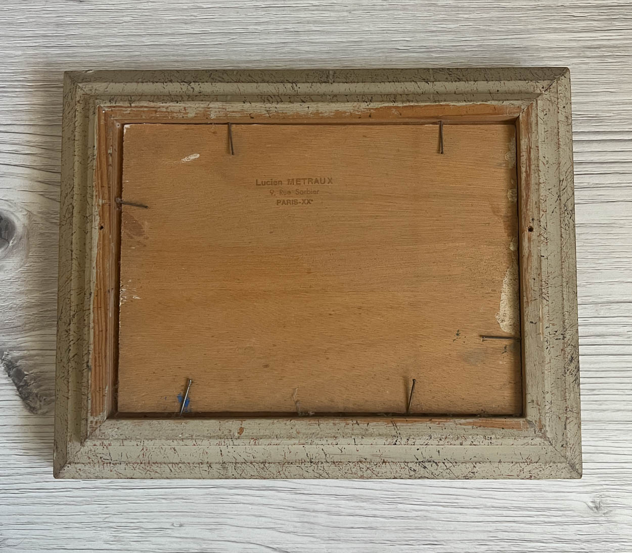 The wooden picture frame measures 11-3/4" by 9-1/4", and is in excellent condition. Paris manufacturer on back of panel.