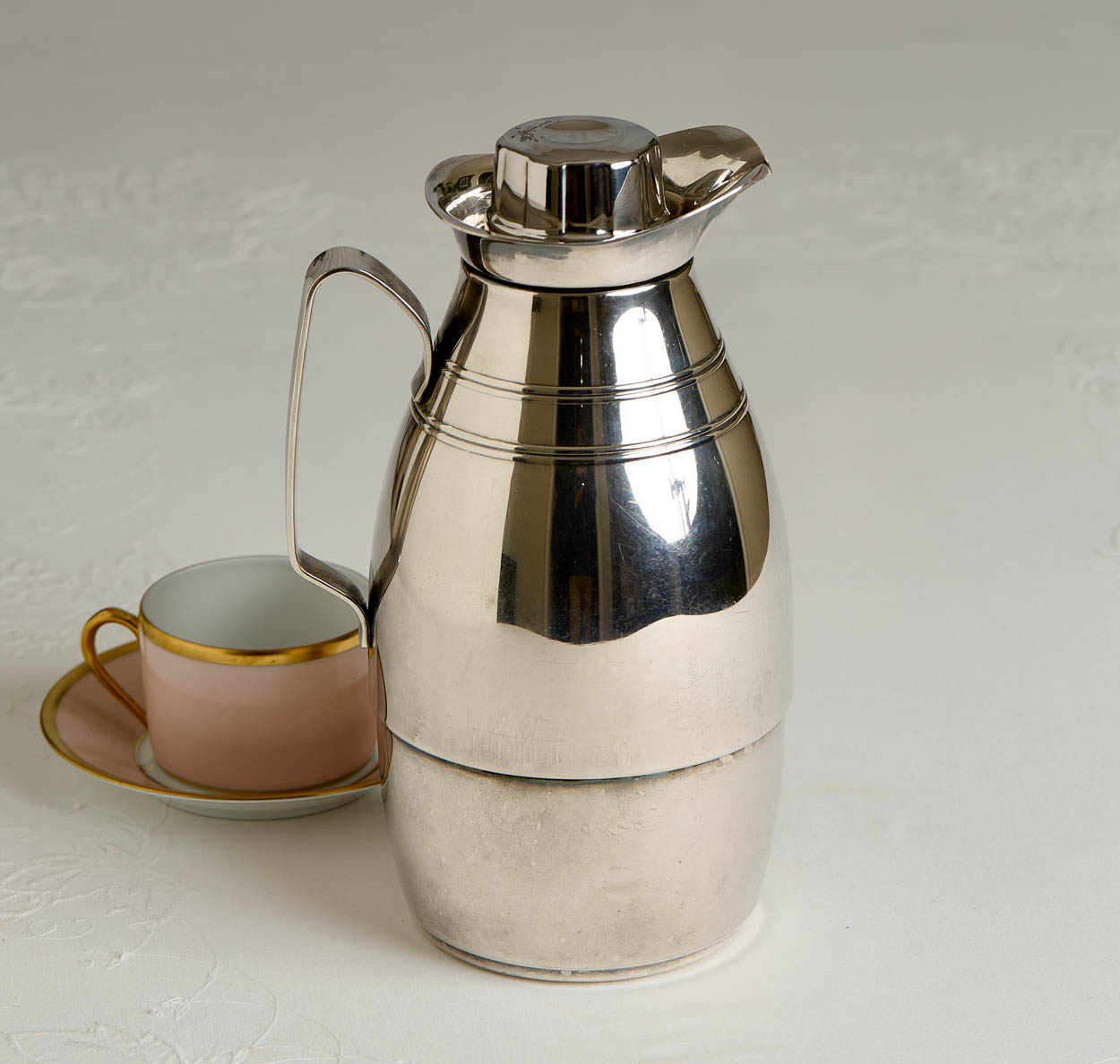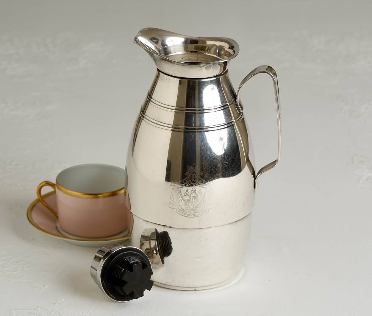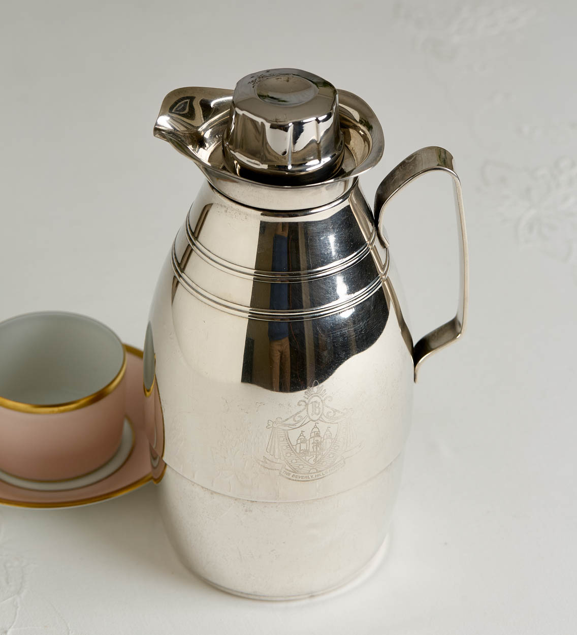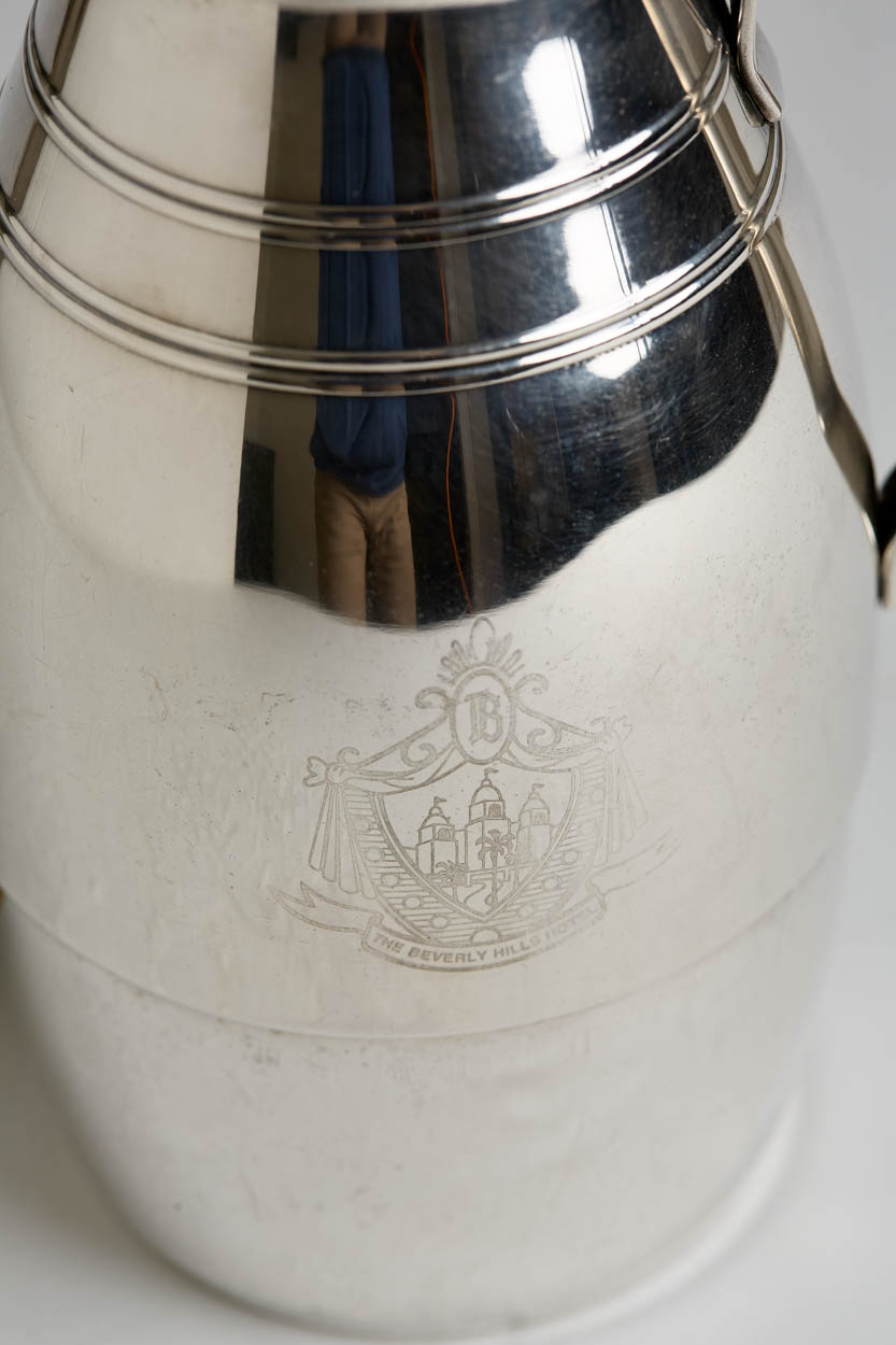 The coffee pot bears the hotel's crest on the side and reads, "Beverly Hills Hotel."