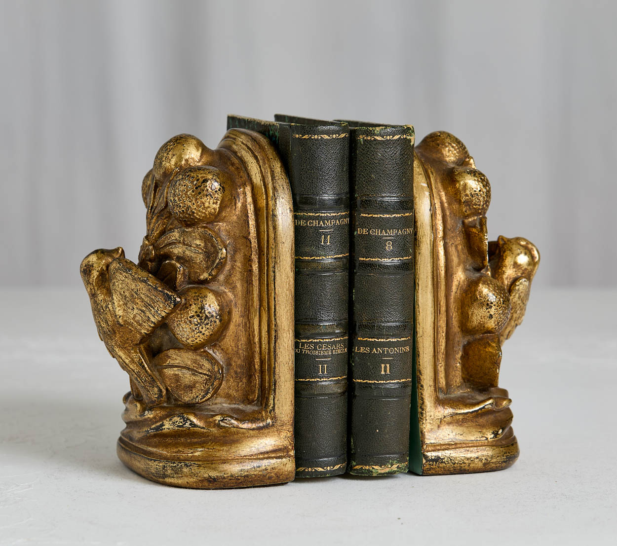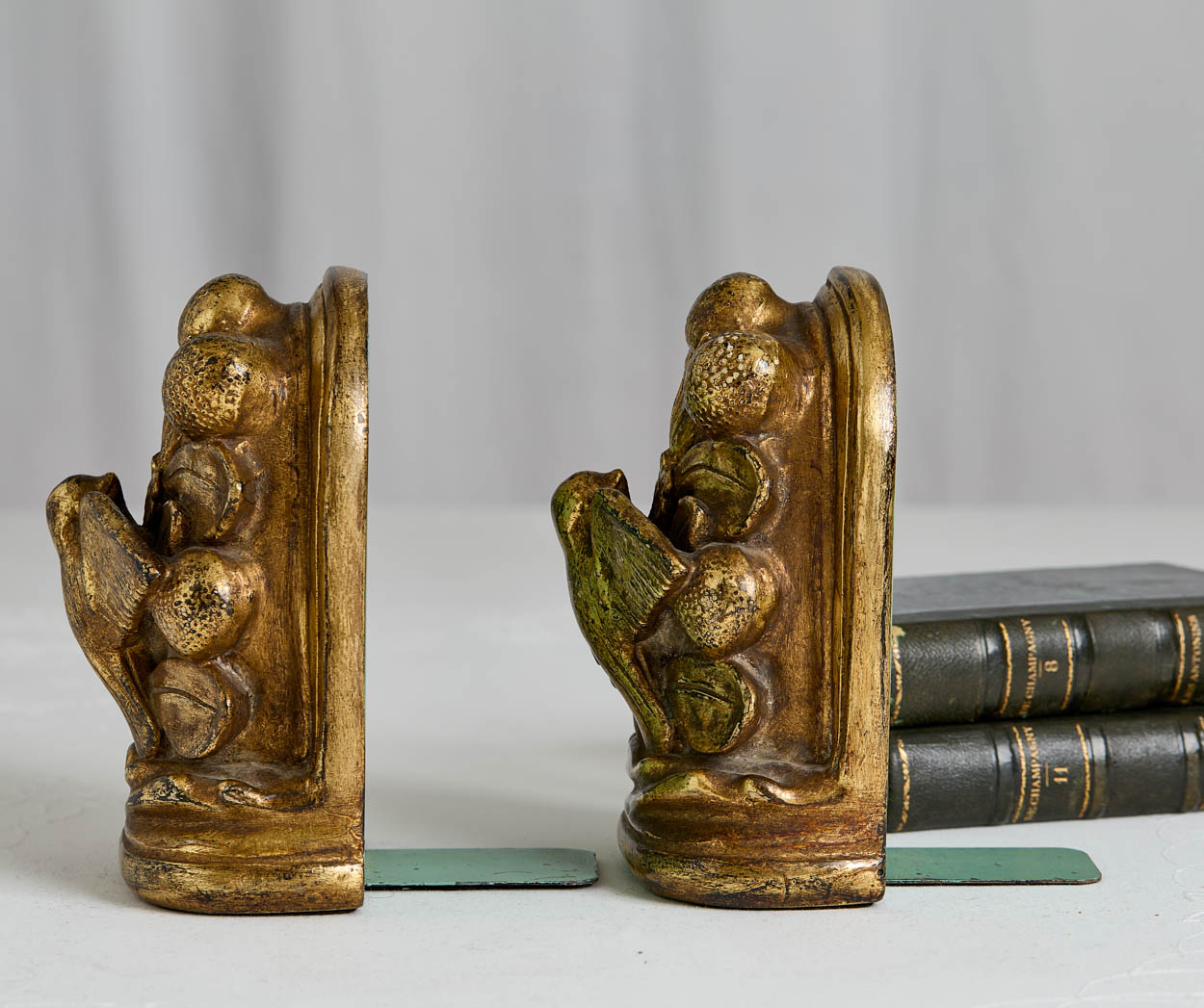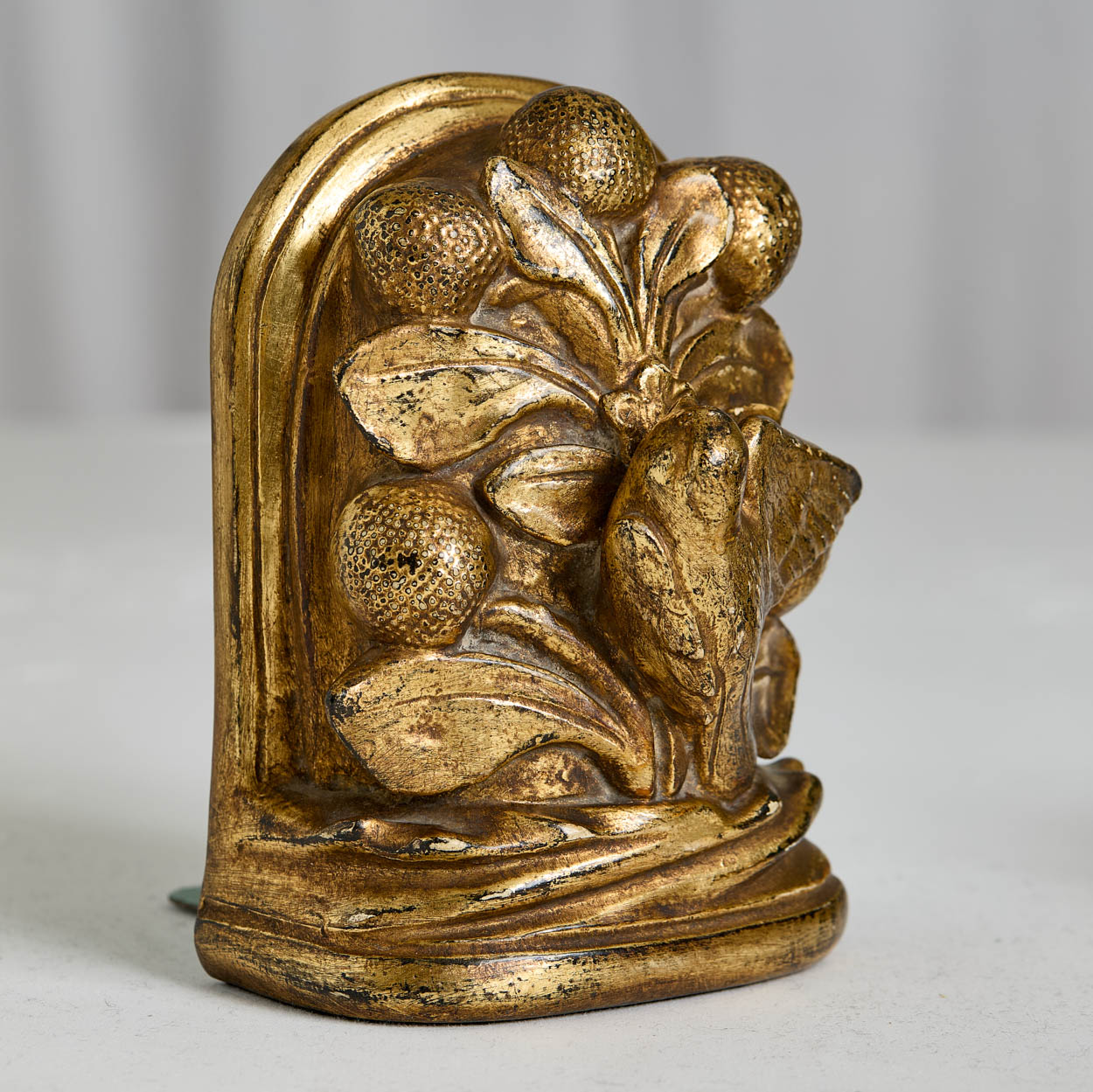 Crafted from wood and plaster, these large bookends feature intricate details of birds and foliage in a gold color finish.