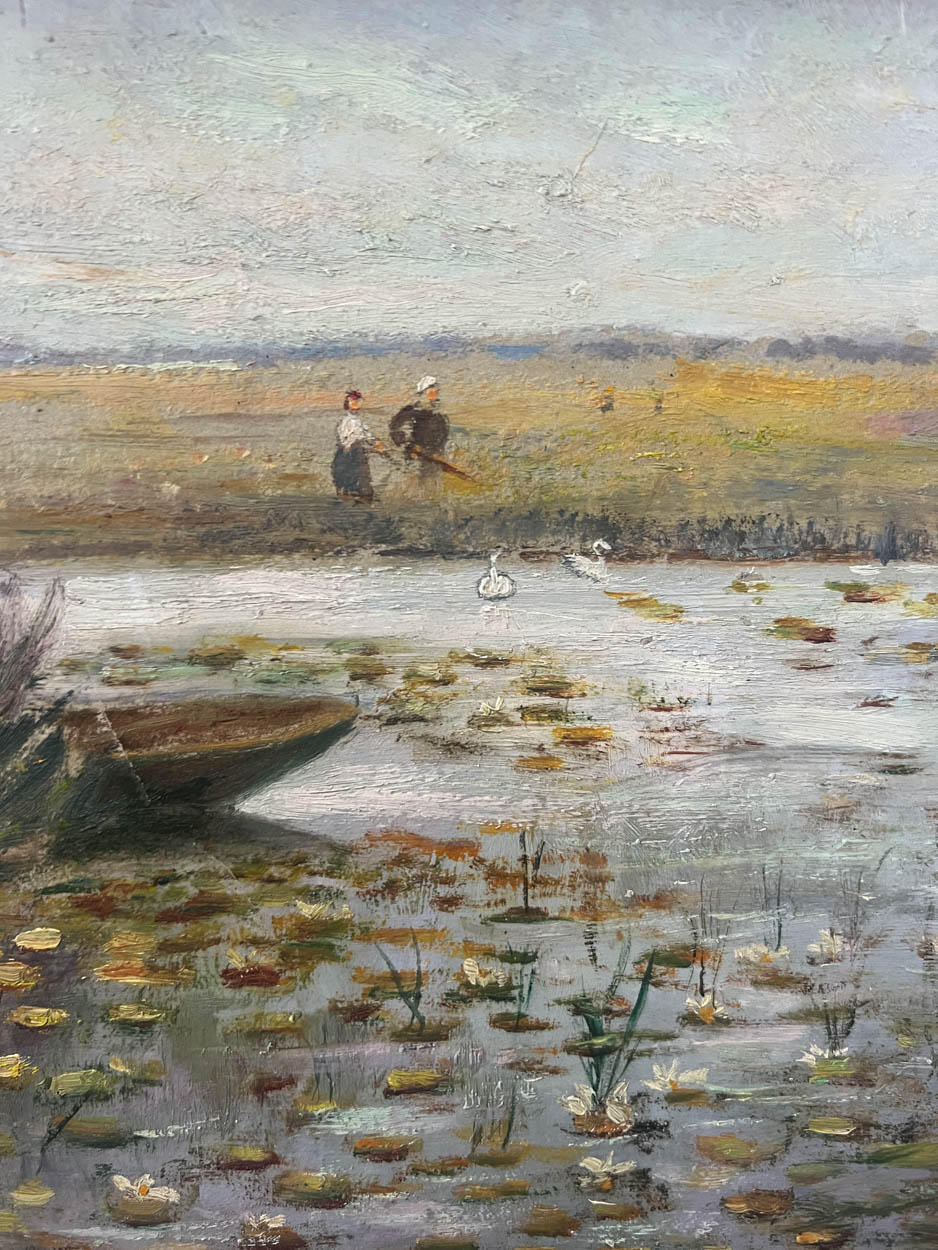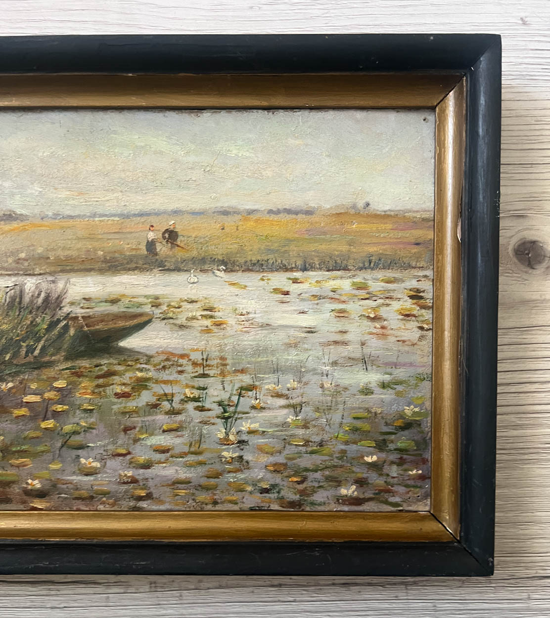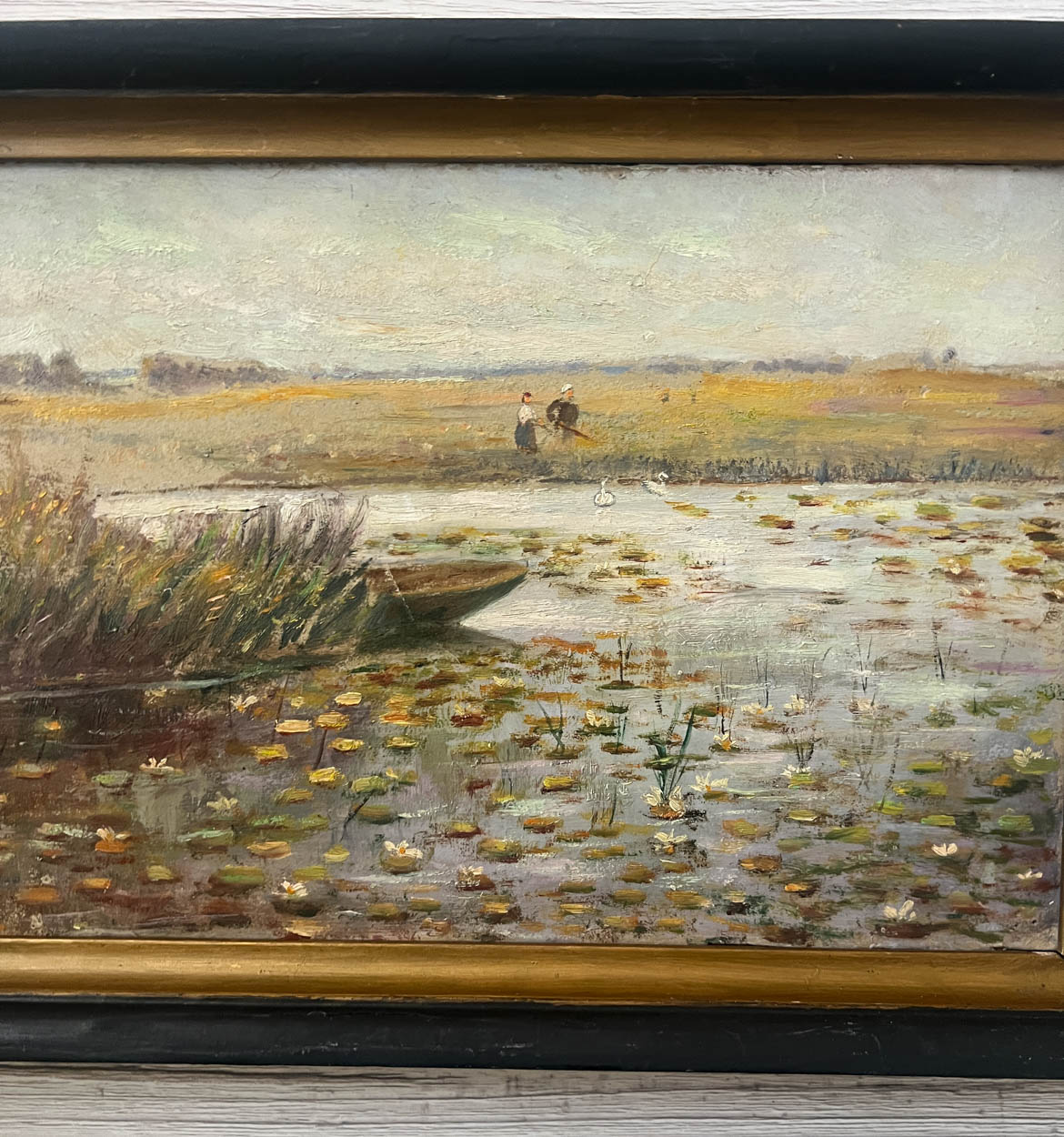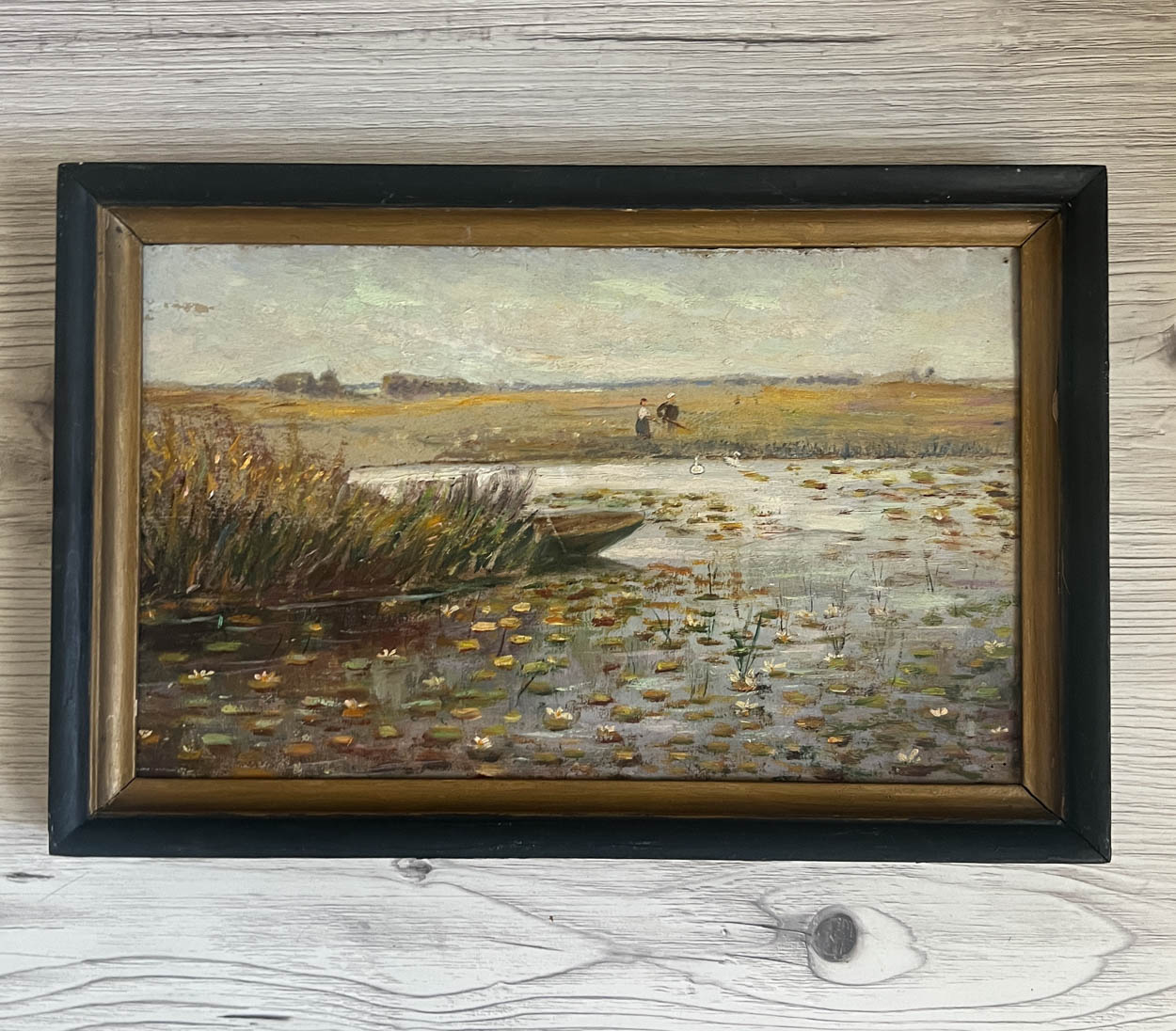 The painting has a small boat and two people in a field. The colors are very pleasing.