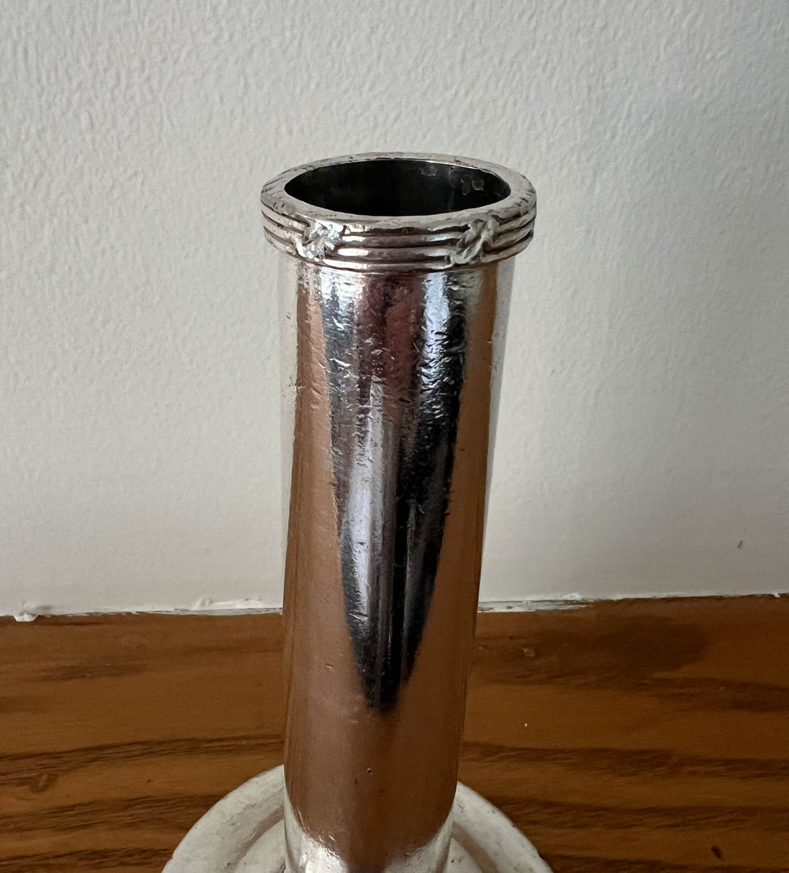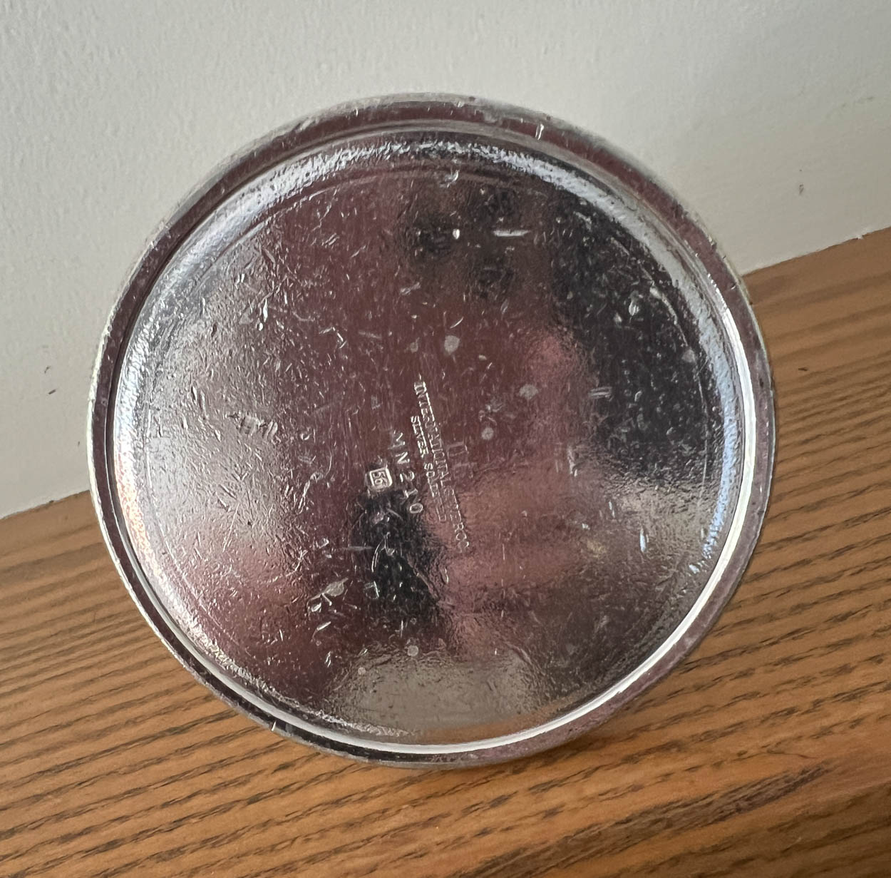 It measures 6-3/4" tall and the base is 3-5/8" and is dated 1956. Manufactured by International Silver Company.