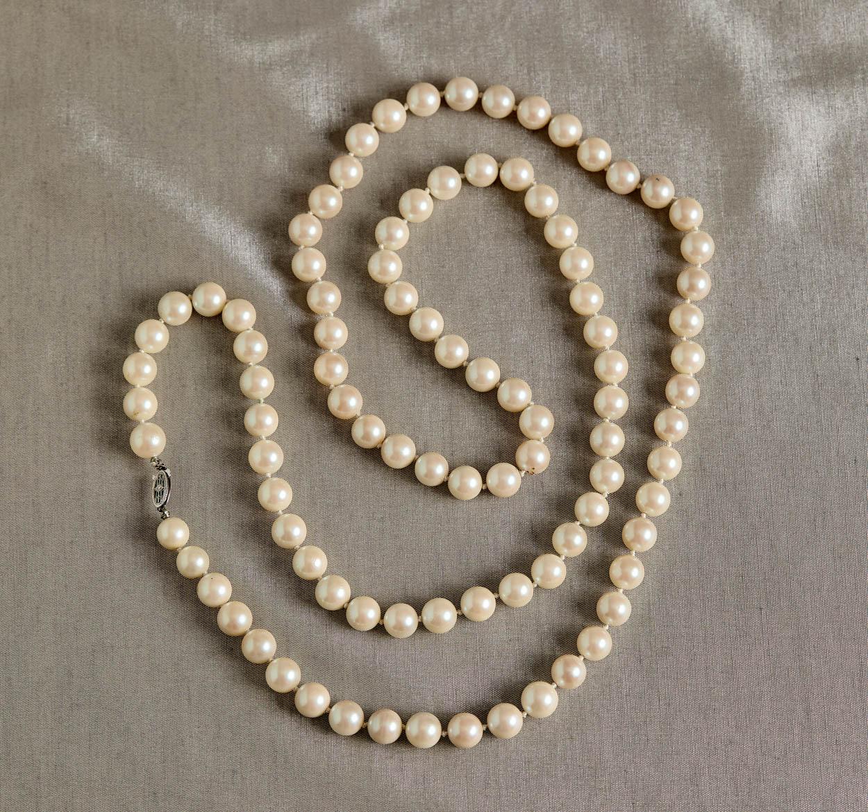 The necklace measures 40" long and has a 14K white gold clasp. Excellent condition.